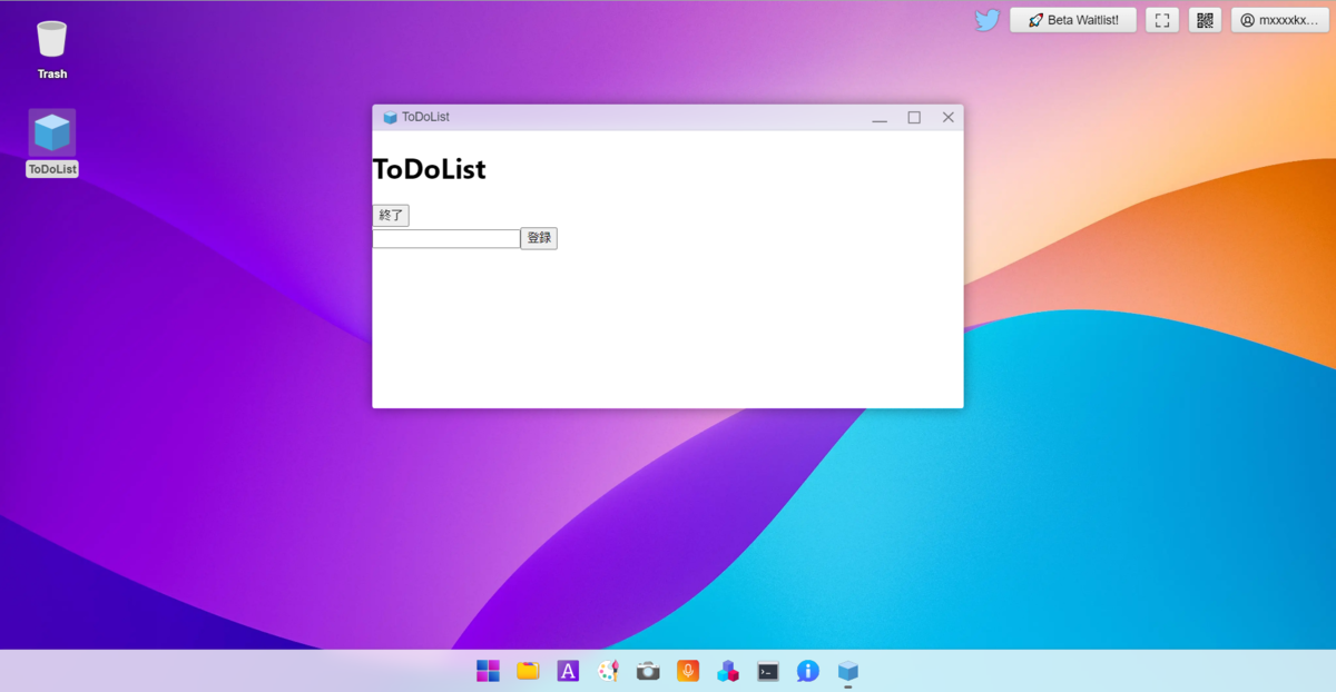 デスクトップ上にアイコンができるので、それをダブルクリックすると ToDo アプリが起動します。「終了」ボタンを押すと期待通りアプリが終了してくれます。